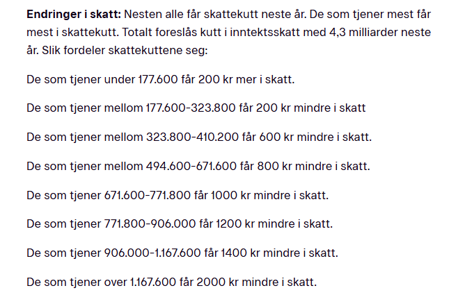 Salvesen. Skrevet 1 time siden Skrevet 1 time siden Baranladion skrev (1 minutt siden): Og hadde man fått 10 kr og jeg misforstod at det var 1kr så hadde skattelettene vært 10x så store. Poenget her, er at et løfte er innfridd, skatteletter, men jeg syns det er riktig å også formidle, at disse skattelettene ikke betyr en dritt for noen. Ikke de som tjener mye, ikke de som tjener lite. Altså, jeg kan godt skrive om førsteposten min fra 66 til 264, men poenget står akkurat like godt med den summen. Ta deg en tur ut, spør tilfeldige hva de tenker om å få 300kr mindre i skatt, se hvor mange high fives du får. Det er helt inennfor forventningene om en har fulgt litt med. Men, problemet er at du og folk flest svelger det som blir skrevet hvert år om tikroninger. Og skattelette er bare en del, så har en norgespris, så har en lønnsøkning osv. Totalen blir faktisk en del. Personlig får jeg nok en gang en tusenlapp+ mer i måneden bare i skattelette. Norgespris ser ut til å gi meg noen hundrelapper mer, så kommer jo lønnsøkning på toppen samt nedgang i renter osv. Til sammen snakker vi nok en del tusenlapper, slik som det har vært de siste 5 årene. Skulle helst sett at de gikk til de som sliter, hos meg går de rett på sparekonto.. 1