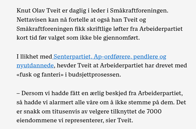 Tussi Skrevet 2 timer siden Skrevet 2 timer siden obygda skrev (5 minutter siden): https://www.nettavisen.no/nyheter/nytt-ap-sjokk-avslort-i-epost-vi-ble-lurt/s/5-95-2682299 Det er altså ikke bare løftet til Vedum som ble brutt. Her kan man vise til e-post der lovnader ble gitt før valget..som man bryter etter valget Dette blir bare verre og verre, de eier ikke skam! Dette bør få konsekvenser for støre, han bør gå av 1