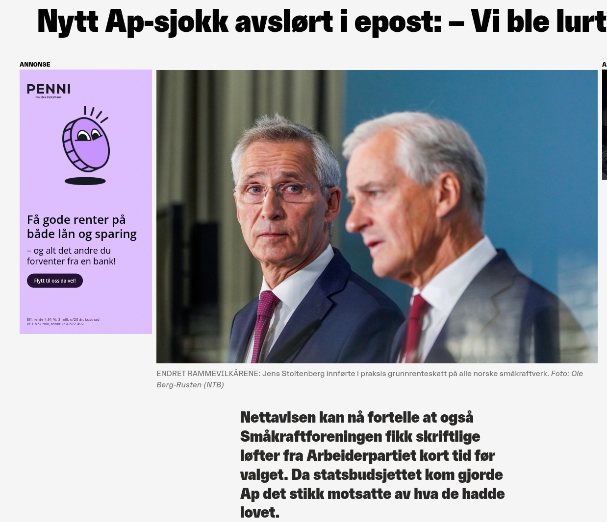 obygda Skrevet 3 timer siden Skrevet 3 timer siden https://www.nettavisen.no/nyheter/nytt-ap-sjokk-avslort-i-epost-vi-ble-lurt/s/5-95-2682299 Det er altså ikke bare løftet til Vedum som ble brutt. Her kan man vise til e-post der lovnader ble gitt før valget..som man bryter etter valget 4 1