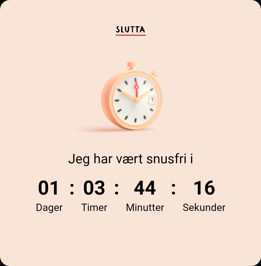 Boing_80 Skrevet 12 timer siden Forfatter Skrevet 12 timer siden I følge Slutta appen har jeg vært snusfri i en dag Men det er tøft. 2 1