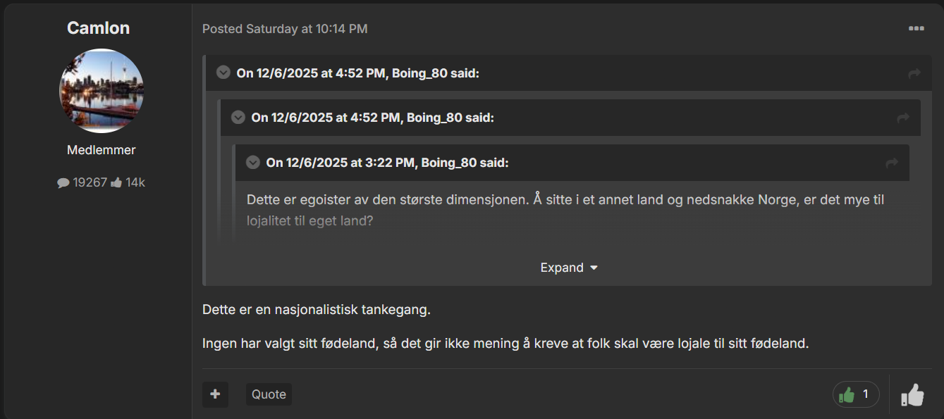 Camlon Skrevet mandag kl 23:20 Skrevet mandag kl 23:20 40 minutes ago, Krig og fred said: Hallo, jeg siterte deg. Jeg siterte deg. Hvordan er det løgn når jeg ikke har påstått at det er noe Quisling har sagt. Nei, du siterte ikke meg. Du skrev: "Ingen har valgt sitt fødeland, så det gir ikke mening å kreve at folk skal være lojale til sitt fødeland." – Vidkun Quisling taler til folket, 1941. Det er ikke “jeg siterer deg”, det er å legge ordene i munnen på Quisling. Det er også noe Quisling aldri ville sagt eller ment. 40 minutes ago, Krig og fred said: Koblingen til Quisling, en sviker og landsforræder, er påstanden om at man ikke skal ha lojalitet ovenfor sitt fødeland. Og for en absurd påstand om at Quisling var nasjonalist. Fritjof Nansen var nasjonalist. Quisling forrådte Norge, og sendte nordmenn i døden. Jeg skal ikke legge ord i munnen på deg, så du kan selv svare for om du synes folk som barberer hodet og vifter med norske flagg er særlig patriotiske. At Quisling var nasjonalist er ikke en “absurd påstand”, det er helt grunnleggende faktum. Partiet hans het Nasjonal Samling, ideologien var nasjonalsosialisme, og talene hans er fulle av "det norske folk", "Norges skjebne" og "lojalitet mot bevegelsen og nasjonen". At han forrådte Norge og sendte nordmenn i døden gjør ikke nasjonalismen hans mindre reell, bare mer grotesk. 4