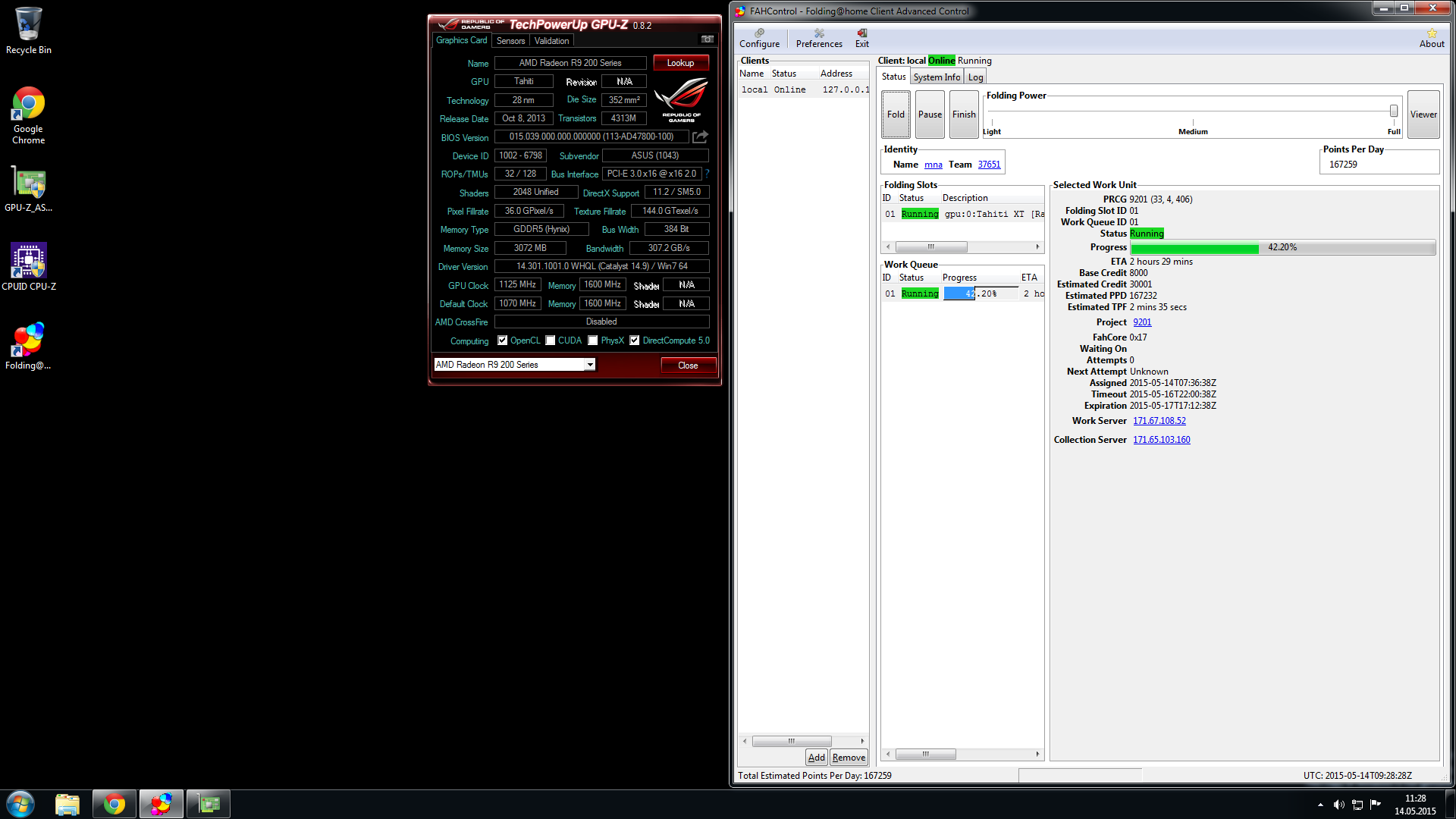 Fade1 Skrevet 14. mai 2015 Skrevet 14. mai 2015 Jeg tenker å bygge meg en rigg som bare står og folder. Med et 280x som gir mest PPD for pengene. Bare gpu folding. Tenkte skaffe så billig cpu som mulig. Vil en svak cpu trekke ned PPD når jeg bare bruker gpu til folding? Da er jeg med på Team Hardware jeg og Har et 7970 kort som jeg vil grille litt. Lurer på hvor lenge ca man må vente får se navnet sitt på lista? 970 gir med ppd pr krone. Mitt 980 gir rundt 360k ppd, mens 970 gir 295k ppd Hmmm... Ser ut som Nvidiakortene gir mer folding enn AMD. Jeg får bare 187k PPD på hvert av mine 290X jeg bruker omega drivern til 290x og ligger rundt 550- 620k ppd med 2 stk @1100mhz til 280x/7970 er 14.9 drivern best med den ser jeg 160 - 190k ppd legger ved screens av 280x Lurer på hva som gjør at jeg får så lite PPD med mine kort... Nå ligger jeg på 257k, med 2 stk 290X + CPU.