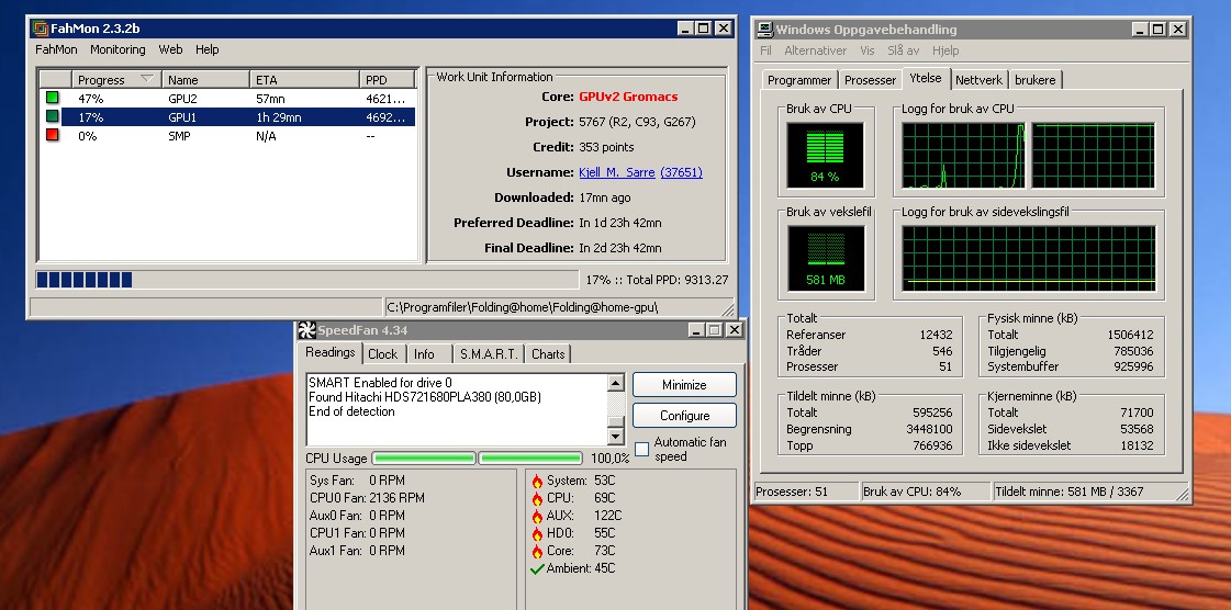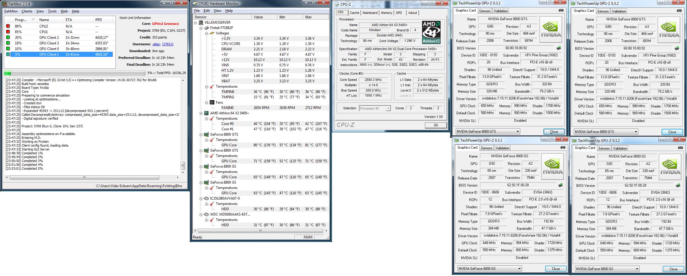 Da var nytt HK ankommet og montert, og 4 x GPU i produksjon. Opplevde forresten noe merkelig som egentlig ikke skal være mulig. Siste HK før det nye var et MSI X48 Platinium med Intel X2 E6850. Nytt HK er MSI K9A2 Platinium med AMD X2 5400+. Den nye konfigurasjonen bootet rett opp på den gamle installasjonen av Vista Ultimate 64. Resatte 2 - 3 ganger og alt av hardware var gjenfunnet og korrekt innstallert. Resatte en gang til og Vista oppdaget plutselig at mye hardware var skiftet og nekte nå å boote. Inn med Vista CD, valgte språk og så reparasjon. Resatte og Vista var ok igjen. Alle folding-klienter startet uten noe tull. Hadde på forhånd gjort klar for GPU nr. 3 og 4, som også startet normalt. Startet 2 CPU-klienter, men da blacket hele maskinen ut. Maskinen dro 610W fra veggen, og PSU er på 750W så det skulle ikke være for lite strøm. Lot så være å kjøre CPU-klientene og da ser det ut til å gå. Kan blackouten skyldes for lite strøm? Av CPUID Hardware Monitor kan det se ut som 5V og 12V er faretruende lave. Får håpe at HM ikke viser korrekte spenninger. Uten CPU-klienter drar maskinen nå 540W fra veggen.