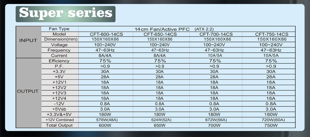 Fant at oppgitt effektivitet er 75%, som vil si at den skal tåle en konstant belastning på omlag 560W. Spørsmålet er hvordan dette fordeles? Her er skjemaet: