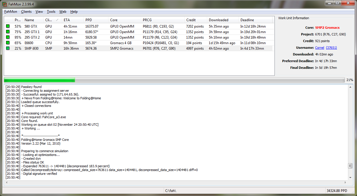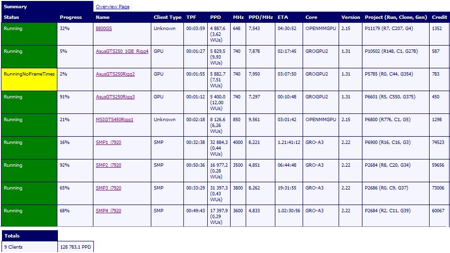 -alias- Skrevet 25. november 2010 Skrevet 25. november 2010 (endret) Er den klienten eg bruker. Kva skjer med dei som det er * bak PPD'n i FahMon? Jeg vet ikke hva * betyr i FahMon, og nei, du har ingen bigadv klient aktiv såvidt jeg kan se. P6701 er en treg vanlig SMP WU som burde ligge på ca. 16 - 17K PPD med din i7 930. Nå viser ikke FahMon bonus etter det jeg husker så det kan likevel være at du har mer PPD der. Bigadv bruker Core GRO-A3 v. 2.22, se min tabell nedenfor hvor de fire nederste er Bigadv. For å klare big burde din i7 930 klokkes til min. 3.5GHz. HFM.NET viser bonus korrekt. Endret 25. november 2010 av -alias-