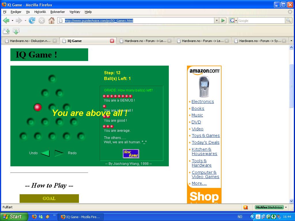 Kimelimm Skrevet 14. mai 2007 Skrevet 14. mai 2007 IQ spill, blir med en gang avhengi RÅTT! Har klart og ha 1 igjen! http://www.puzzlechoice.com/pc/IQ_Gamex.html