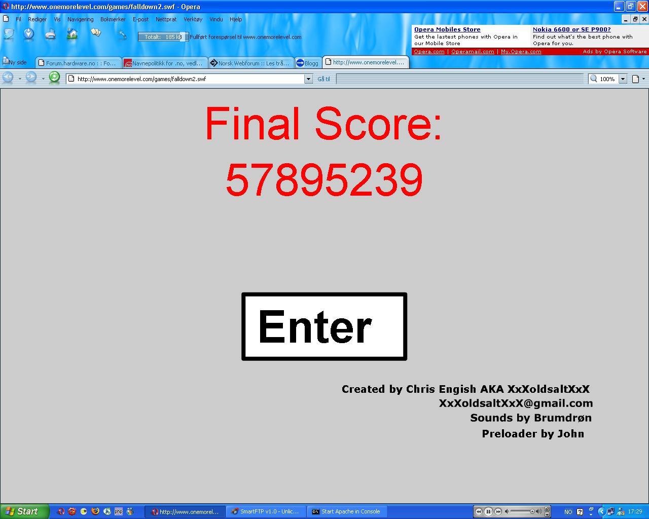 Newt32 Skrevet 19. august 2005 Skrevet 19. august 2005 (endret) Her er FallDown 2 fullscreen Fikk 1029490 der. Endret 19. august 2005 av Newt32