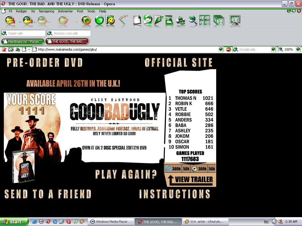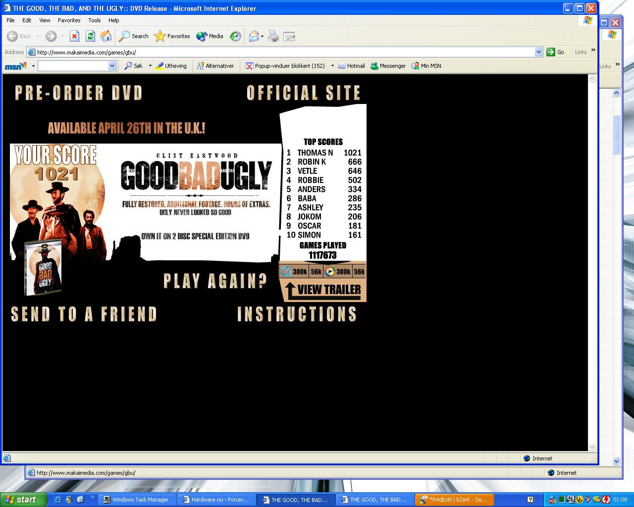 GBD Skrevet 28. august 2005 Skrevet 28. august 2005 jeje etter å ha spilt i snart 30 - 40 minutt så ga jeg opp Best score at the moment og da score 1021 så det at en eller annen hadde 1076 men jeg ga opp, var ikke noe morsomt lengre Uff..dette ble jammen kjedelig etterhvert! Men jeg satte da rekord med 1111 før jeg ikke gadd mer. Tidsbruk: Fant ut at jeg skjøt 20 mann pr. min. 1111/20=55,55 min