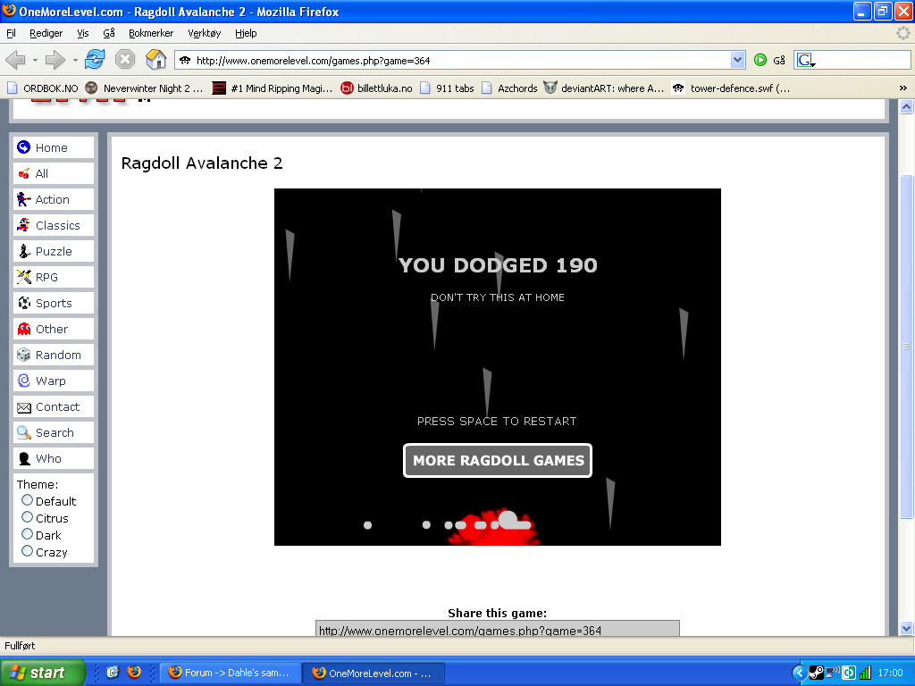 Jack_Daniels Skrevet 10. januar 2007 Skrevet 10. januar 2007 http://www.onemorelevel.com/games.php?game=364 Det spillet der var nesten litt for gøy! rekorden min er 142