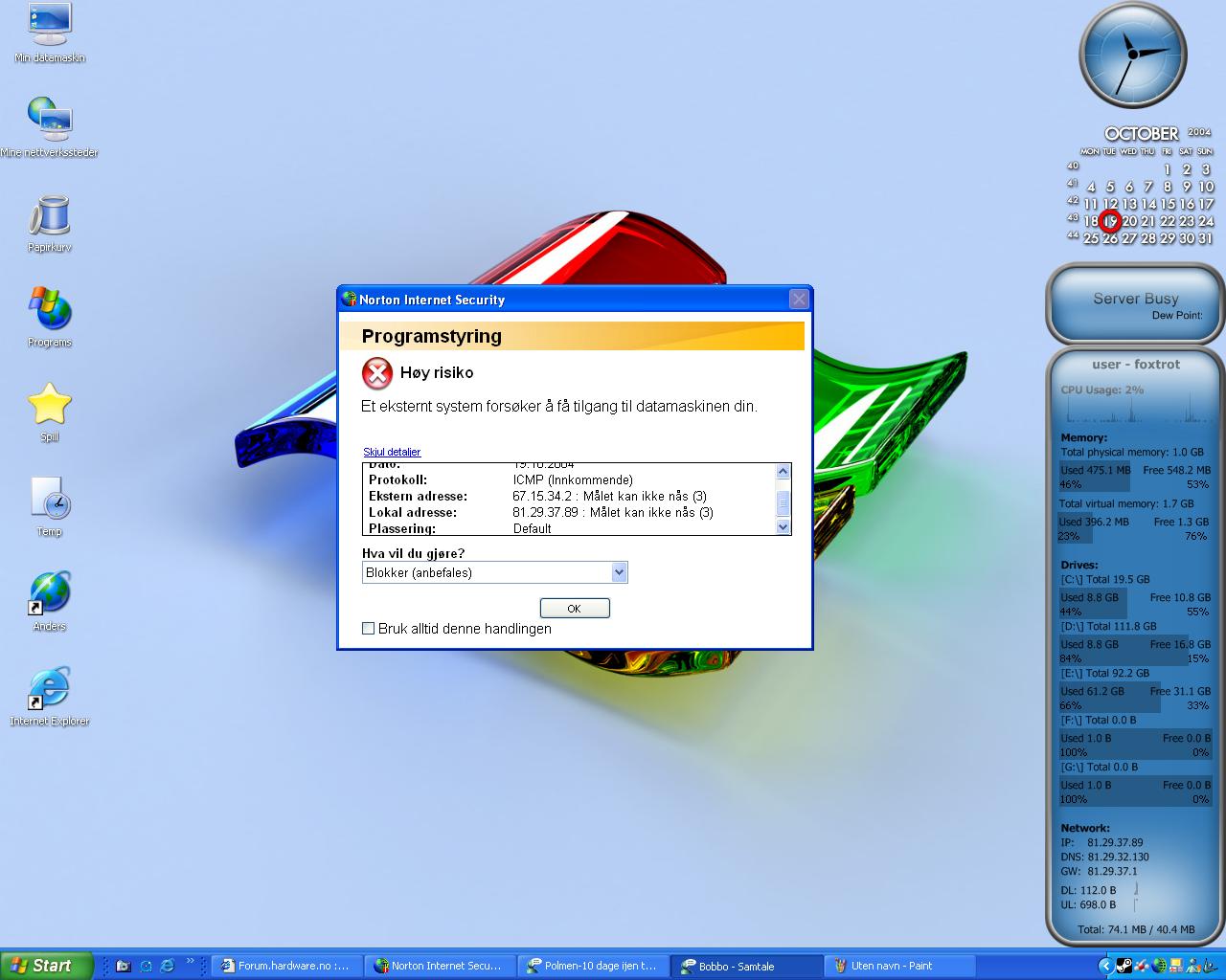 co2 Skrevet 19. oktober 2004 Forfatter Skrevet 19. oktober 2004 Den spør også om jeg vil at programmer skal ha tilgang til internet. Må være en instilling en plass..... åååhh...