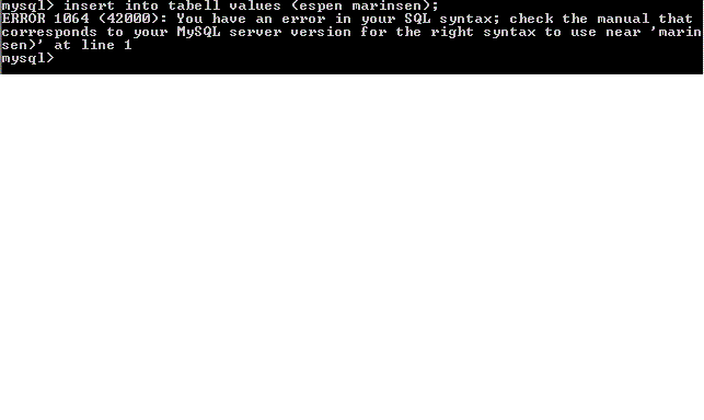 Mr_Tiger Skrevet 24. november 2004 Forfatter Skrevet 24. november 2004 Forsøk å sette espen marinsen i anførselstegn, slik: INSERT INTO tabell VALUES ("espen marinsen"); ...burde gjøre susen... timtowtdi takk, har funnet ut av det nå