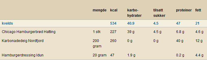 Burger er tingen, lagde meg en 200grams til kvelds her nå. 534 kcal og 47g proteiner. Mett og god!