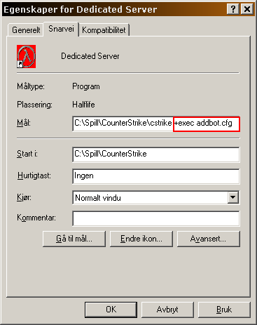 Jakob K Skrevet 15. desember 2004 Skrevet 15. desember 2004 Hvordan setter jeg opp en CS dedicated server på et LAN. Hvilke parameter må jeg ha med etter dette ? C:\Spill\CounterStrike\hlds.exe I mappen C:\Spill\CounterStrike\cstrike\ ligger div. filer som jeg har endret litt på. Bl.a. filen server.cfg som inneholder console-kommandoer. f.eks: mp_friendlyfire 1 Har endret litt i filen mapcycle.txt som inneholder hvilke brett serveren skal skifte mellom hver 20 min. Har endret litt i filen motd.txt som inneholder litt info til de som connecter til serveren. Serveren skal ha 20 spillere. (maxplayers 20) Jeg bruker av og til boter, kan jeg legge dem inn på serveren ? Har laget et script som heter addbots.cfg som lager boter, men jeg finner ikke ut hvordan jeg starter scriptet på dedicated server. Kan noen lage et eksempel til meg hva jeg må skrive i snarveien til HLDS.exe Hvis noen hjelper så må dere ha tusen takk !!! Vedlagt eksempel på snarvei til HLDS.exe ved plassering i C:\Spill\CounterStrike\. Den laster automatisk addbots.cfg, fra \cstrike mappa. Hvis du ikke vil at den skal lastes automatisk, kan du bare starte HLDS.exe uten +exec addbots.cfg i Mål linjen, og senere skrive det inn i enten server-konsollen eller via rcon. Du kan også legge til CS-kommandoer selv, ved å tilføye et + og en konsoll-kommando fra CS i Mål feltet. Både server.cfg, mapcycle.txt og motd.txt skal lastes automatisk. Btw, glemte å legge til dette i Mål på screenshotet; -game cstrike +sv_lan 1 +map de_dust (f.eks)