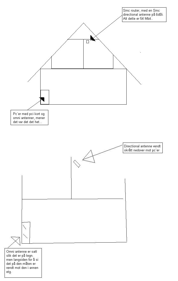 -=Petter=- Skrevet 16. desember 2004 Skrevet 16. desember 2004 sorry at det ikke sto noe annet en topic... men jeg fikk bare en error, desverre så jeg prøver igjen jegh ar smc2804WBR router som jeg også har koblet til en drictional antenne. som jeg fikk høre jeg burde gjøre. jeg har to maskiner i første etg med tilhørende pci kort, som er kjøpt til routeren. også smc. slik er det satt opp jaja nå ser det ikke ut som om bildet vil opp på nett men men... jeg prøver å forklare... jeg har router i 2 etg. og pcene i 1 etg.. det er et gulv og en vegg i mellom, og det er snakk om en avstand på maks 8 meter... den directional antenne er satt opp slik at den peker rett ned mot pcene (altså skrått ned) og pinne antennene på datamasinene er satt slikt at sidene på dem går opp mot den igjen (dem også da altså skrått)... sikkert ikke enkelt å forstå hva jeg mener men det er jun slik jeg klarer å forklare det...