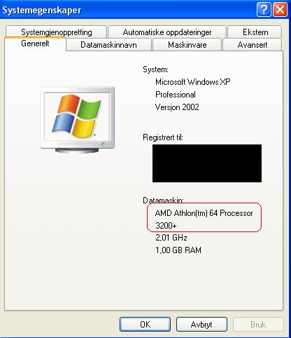 Full Metal Jacket Skrevet 1. januar 2005 Skrevet 1. januar 2005 (endret) legg inn everest home edition fra lavalys edit : eller høyreklikk på min datamaskin \egenskaper så ser du på navnet som står der "intel xxxxx" Eller "AMD xxxxx" xxxxx= resten av navnet edit 2: utifra dette kan vi si hvilken socket det er (mest sannsynlig anyway) sånn som dette : Endret 1. januar 2005 av F-14