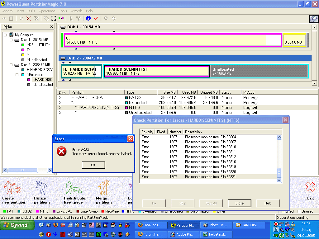 oyvindoyvind Skrevet 4. januar 2005 Skrevet 4. januar 2005 (endret) Hei. Jeg har en western digital 250GB hdd (USB2-tilkoblet), opprinnelig fat32 formatert. Har opprettet en ny NTFS partisjon, og det gikk greit. Men nå, når jeg skulle opprette enda en ny NTFS, og kvitte meg med den gamle FAT32'n, så gikk ting til helvete, Fått masse feilmeldinger og har måttet rette opp med chkdsc /f/x, da partition magic 7 ikke fiksa det. Det siste som skjedde var at NTFS-partisjonen min har mistet sin "drive letter", så jeg finner den ikke i browsern. Men jeg kan se at partisjonen er der i partition magic. Prøve jeg å sjekke den for error får jeg masse feilmeldinger, blant annet "1607 file table backup mismatc" og "1607 File record marked free, File xxx" og til slutt en error-popup "error #983 - to many errors found - process halted". Dette skjedde etter at jeg måtte avbryte opprettinga av en ny partisjon (hang i over en halvtime)... desp. må ha hjelp. kan ikke miste dataene. (vedlegg: screenshot fra partition magic) Endret 4. januar 2005 av oyvindoyvind