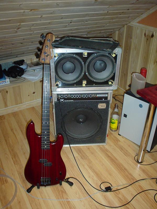 Jonki Skrevet 6. april 2005 Skrevet 6. april 2005 mens jeg er her, så kan jeg slenge opp et bilde av riggen min Bass : Warmoth Custom P-Bass Mahogni kropp med dyp rød transparent lakk, goncalo alves hals, linja fretless ibenholt, Bartolini 8S pickup, Schaller hardware, Ernie Ball flatwounds. Rig : Gallien & Krueger RCB200 100w combo med EV 15" element og 2x10" elementer Effekter : kommer snart, blir antagelig en Morley Wah og Digitech distortion pedal