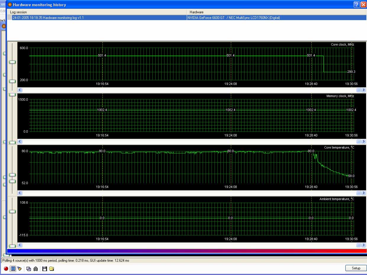 KongeOdin Skrevet 24. januar 2005 Skrevet 24. januar 2005 (endret) Jeg har bare prøvd 67.03. Jeg fikk topper med maxtemp på 86 C i 3dmark 2003 med disse også. Med AA og AF på fullt og spille Warcraft :DOTA i en time så lå temperaturen på mellom 78 og 80. Egentlig greit nok. Klarte ikke å registrere særlig forskjell i tempen. Ellers så pleier tempen på GPU å variere mellom 55 og 56 med surfing o.l. i windows. CPU tempen min er gjerne 58-59 i kjernen og 38 på sokkelen. En vifte i kabinettet viser gjerne rundt 31, men er ikke helt sikker på hvor denne sensoren er hen. Legger til bilde av de siste minuttene: Endret 24. januar 2005 av KongeOdin