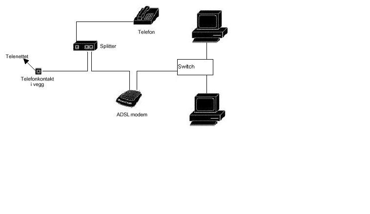 Wooho Skrevet 28. januar 2005 Skrevet 28. januar 2005 Hva slags ADSL leverandør har du? Regner med at du har spurt de om du kan få dele ADSL linja de mellom to PC`er og de har svart: "Joa går fint det putt inn to nettverkskort i en PC så vips" Er en mulighet det også men fy søren til kompetanse de folka har. I så fall så må den PC`en med to nettverkskort være på hver gang du skal ut på nettet med den andre. Nei og nei, her er mitt forslag. Lurer på om det med kryssakabler skal funke? Mitt råd er å skaffe deg ukryssa kabler fordi det er det mest vanlige når man skal koble seg opp mot internett ala ADSL. Så kjøper du en switsch som du da bruker til å koble de to PC`ene som skal ha internett tilgang og LAN-tilgang. Da trenger du ikke å ha 2 stk nettverkskort i den ene PC`en. Dette oppsettet skal funke fordi jeg har maken hjemme, pluss at du sliper å ha begge maskinene på for å surfe på nettet. Jeg legger også ved et bilde som jeg har modifisert slik at det forklarer deg litt nærmere det jeg har fortalt ovenfor. Du finner også foresten en del om ADSL her:ADSL tilkobling