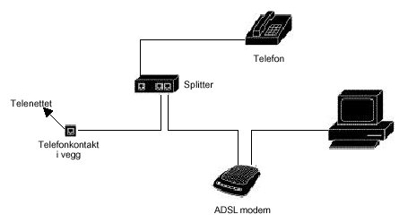 Martinabc Skrevet 29. januar 2005 Forfatter Skrevet 29. januar 2005 (endret) Hovedlendingen kommer inn i overgangen på telefonkontakten, en nettverkskabel gårr inn i splitteren, en telefonlinje går bort til telefonene og en teleflinje går til fra splitteren og inn i modemet/ruteren. Derreter går det en nettverkskabel inn i modemet og inn i Jensen Switchen. Slik som på tegningen. Endret 29. januar 2005 av gamemaster_001