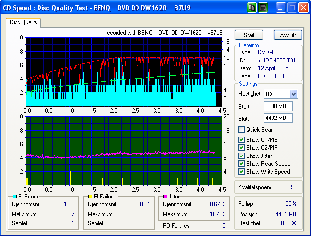 Psh Skrevet 12. april 2005 Skrevet 12. april 2005 8X Beste resultat ever! Syykt lite PIF! Kan ikke skjønne at 4X platene fikk så mye bedre resultat på 8X! Nå er jeg keen på å prøve flere Plextor 4X plater på 8X! Etter en deprimerende runde med ProdiscF01, trengte jeg en liten opptur med YUDEN000 T01 Hva med denne, Verbatim Pastel 4x brendt på 12x med B7L9. Her har du noe å bryne deg på 2peewee