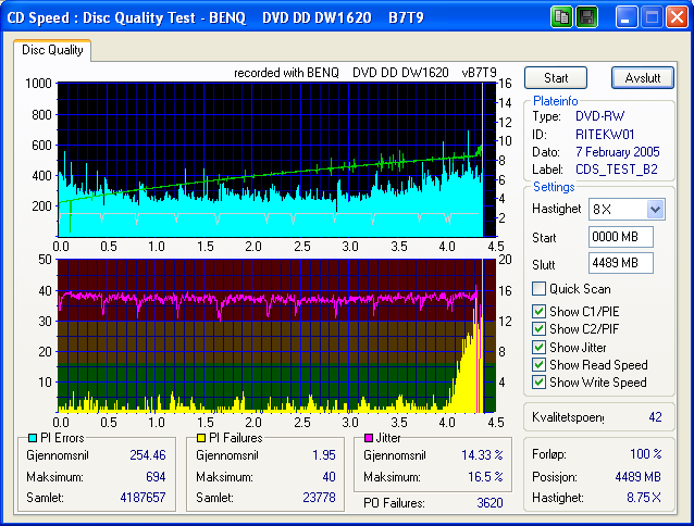 Psh Skrevet 19. april 2005 Skrevet 19. april 2005 Da har jeg testet B7V9 firmwaren litt... Har ikke merket noen stor forskjell i fra B7U9, bortsett i fra på en DVD-RW plate... Platen er av typen Arita DVD-RW 2x (RITEKW01) å den har jeg ikke klart å få noen bra kvalitet på med tidligere firmware som B7T9 og B7U9. Legger med en scan av platen brent med B7T9 (kvaliteten er like dårlig med B7U9)