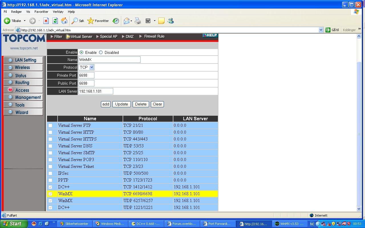 icer Skrevet 5. februar 2005 Skrevet 5. februar 2005 Jeg har en Topcom Skyr@cer ProWBR 654 svitsj, den fungerer bra, men tror den har innebygd brannmur, for når jeg bruker DC++ må jeg bruke passive mode, og nå i det siste har alle brukere som jeg laster ned ifra hatt en speed på 5-10kb\s max, og det er sinnsykt vanskelig å finne brukere som har ledige slot'er. Samme problemet med WinMX, nå får jeg ikke lastet ned noenting, kommer bare connection time out. Er det noen måte jeg kan opne en port slik at jeg laster ned igjennom den?