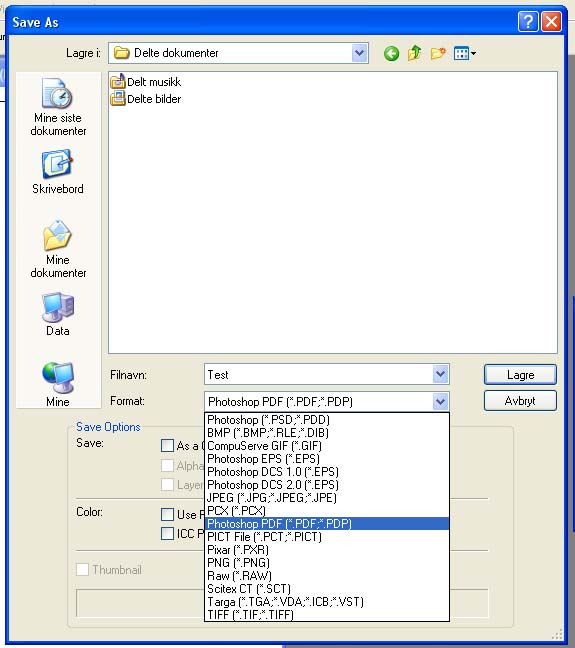 Penneknekt Skrevet 8. februar 2005 Skrevet 8. februar 2005 (endret) For å lagre som PDF i Photoshop velger du ganske enkelt "Save as" og deretter "Photoshop PDF" fra nedrekksmenyen "Format". Se illustrasjon. Endret 8. februar 2005 av Antikapitalist