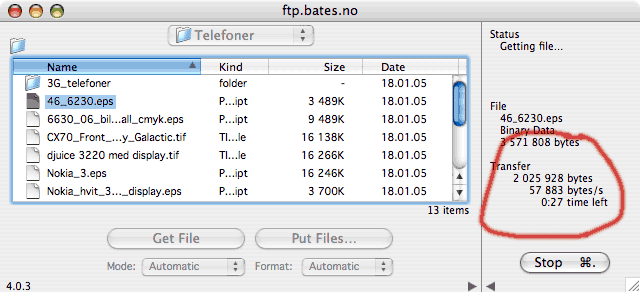 steveak Skrevet 25. februar 2005 Forfatter Skrevet 25. februar 2005 (endret) Filnedlasting med Fetch FTP (bruker Macintosh jeg da...) på 3 mb ca Endret 25. februar 2005 av steveak
