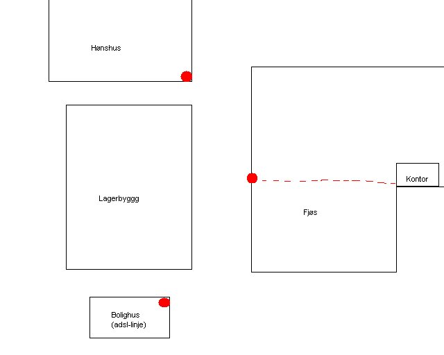 Spole Skrevet 10. mars 2005 Forfatter Skrevet 10. mars 2005 Som Inge Rognmo sa så brukes pc til å registrere div data om formengder osv. Håper på å få til noe liknende med nettverkskamera med tiden.. Layout av gården er lagt ved, PC i fjøset er plassert i kontoret. Bridging, virker dette som en mottaker som sender signalet videre? Tror eg har problemer med å få signalet sterkt nok til å komme gjennom veggen. Trur eg må rundt bygningen.