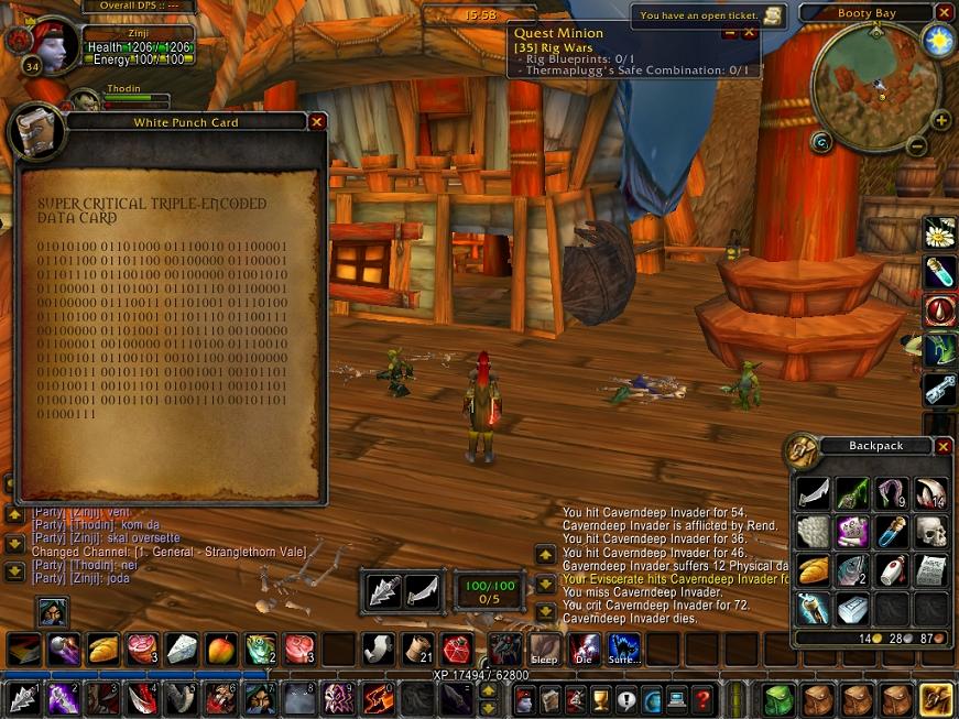 Obi-Wan Skrevet 13. mars 2005 Skrevet 13. mars 2005 Tok screenshot av de alle før jeg slettet dem etter jeg var ferdig med questen, her er dem alle oversatt Yellow Punch Card ULTA VITAL DATA! SECURITY RATING 5122! 01001001 01100110 00100000 01111001 01101111 01110101 00100000 01100011 01100001 01101110 00100000 01110010 01100101 01100001 01100100 00100000 01110100 01101000 01101001 01110011 00101100 00100000 01111001 01101111 01110101 00100111 01110010 01100101 00100000 01110011 01110100 01100001 01101110 01100100 01101001 01101110 01100111 00100000 01110100 01101111 01101111 00100000 01100011 01101100 01101111 01110011 01100101 = If you can read this, you're standing too close Red Punch Card SECURITY RATING 10^10000 SUPER SENSITIVE DATA! 01001000 01100101 01101100 01110000 00100001 00100000 00100000 01001001 00100111 01101101 00100000 01110100 01110010 01100001 01110000 01110000 01100101 01100100 00100000 01101001 01101110 00100000 01100001 00100000 01100010 01101001 01101110 01100001 01110010 01111001 00100000 01110000 01110101 01101110 01100011 01101000 00100000 01100011 01100001 01110010 01100100 00100000 01100110 01100001 01100011 01110100 01101111 01110010 01111001 00100001 = Help! I'm trapped in a binary punch card factory! White Punch Card SUPER CRITICAL TRIPLE-ENCODED DATA CARD 01010100 01101000 01110010 01100001 01101100 01101100 00100000 01100001 01101110 01100100 00100000 01001010 01100001 01101001 01101110 01100001 00100000 01110011 01101001 01110100 01110100 01101001 01101110 01100111 00100000 01101001 01101110 00100000 01100001 00100000 01110100 01110010 01100101 01100101 00101100 00100000 01001011 00101101 01001001 00101101 01010011 00101101 01010011 00101101 01001001 00101101 01001110 00101101 01000111 = Thrall and Jaina sitting in a tree, K-I-S-S-I-N-G Blue Punch Card Do NOT let this information into enemy hands! 01010100 01101000 01100101 00100000 01100111 01101110 01101111 01101101 01100101 00100000 01101011 01101001 01101110 01100111 00100000 01110111 01100101 01100001 01110010 01110011 00100000 01101110 01101001 01100111 01101000 01110100 00100000 01100101 01101100 01100110 00100000 01110101 01101110 01100100 01100101 01110010 01110111 01100101 01100001 01110010 = The gnome king wears night elf underwear Prismatic Punch Card 01001101 01100101 01110011 01110011 01100001 01100111 01100101 00100000 01110100 01101111 00100000 01000011 01100001 01110011 01110100 01110000 01101001 01110000 01100101 00111010 00100000 01111001 01101111 01110101 01110010 00100000 01101100 01100001 01110101 01101110 01100100 01110010 01111001 00100111 01110011 00100000 01110010 01100101 01100001 01100100 01111001 00100000 01100110 01101111 01110010 00100000 01110000 01101001 01100011 01101011 01110101 01110000 00101110 = Message to Castpipe: your laundry's ready for pickup. Den siste er den som du skal levere som quest objekt om jeg ikke tar feil..