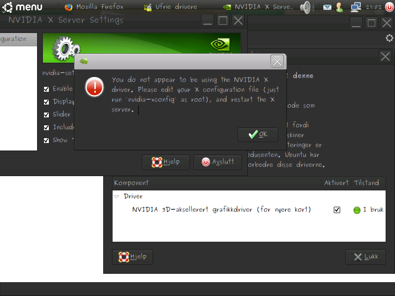 Marsan Skrevet 15. februar 2008 Skrevet 15. februar 2008 (endret) Hei . Jeg har hatt litt problem i det siste med ubuntu 7.10. Det hele starta da jeg innstallerte den nye compiz fusion versonen. Det er ikke så ille, men for å fikse dette tenkte jeg at dette ville løse seg med en innstallasjon av nye drivere i form av .run pakker fra nvidia.com Dette viste seg ikke å være det smarteste jeg har gjort da jeg nå ikke får aktivert noen nvidia-drivere. Enten så må jeg kjøre high-res uten 3d aksellerasjon, eller så må jeg kjøre "aktivert" nvidia driver i low-res. Det jeg syns er litt rart er at i restricted manageren står nvidia-driverne aktivert og i bruk men jeg får beskjed om at jeg ikke kjører nvidiadrivere hvis jeg kjører nvidia-settings. (Se vedlagt bilde). Noen måte å fikse dette uten å reinstallere hele ubuntu? (jeg har brukt ubuntu i ett å et halvt år men nå fant jeg ingen løsning selv) EDIT: Den boksen sier at jeg skal kjøre nvidia-xconfig men det hjelper ikke i det hele tatt. EDIT2: Jeg mekka det nå, tok bort alle nvidia-glx pakkene som var innstallert og la de til igjenn. Men får fortsatt ikke compiz fusion til å fungere enda, men jeg får søke litt rundt. EDIT3: Ser ut som jeg ikke helt har fått driverne til å kjøre likevell. Får ikke til å kjøre Compiz fusion og heller ikke glxgears marsan@marsan-desktop:~$ compiz --replace Checking for Xgl: not present. Detected PCI ID for VGA: 01:00.0 0300: 10de:0342 (rev a1) (prog-if 00 [VGA]) Flags: bus master, VGA palette snoop, 66MHz, medium devsel, latency 248, IRQ 16 Checking for texture_from_pixmap: not present. Trying again with indirect rendering: Checking for texture_from_pixmap: not present. aborting and using fallback: /usr/bin/metacity marsan@marsan-desktop:~$ glxgears Xlib: extension "GLX" missing on display ":0.0". Error: couldn't get an RGB, Double-buffered visual Endret 15. februar 2008 av Marsan