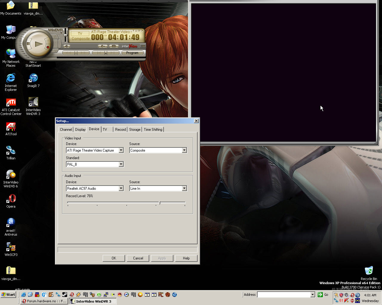 wiak Skrevet 27. april 2005 Skrevet 27. april 2005 (endret) 1. Last ned WinDVR 2. Koble til gule kablen fra PS2/xbox/gc/dvdspillern/vhsen? ! 3. Les Manualen vis du ikke fulgte med på 2.ern ("#¤"%"&) 4. Installer WinDVR 5. Skru på det du kobla til 6. Start WinDVR! PS: jeg spillte en James Bond film det vises ikke når jeg tar screenshot hehe Endret 27. april 2005 av wiak