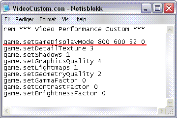 ED209 Skrevet 26. april 2005 Skrevet 26. april 2005 (endret) Gjør samme prosedyre som jeg har skrevet i dette innlegget. Bruk samme adresse, men inne i BFV mappa. Funker på akkurat samme viset. http://forum.hardware.no/index.php?showtopic=406481 Edit: Skal hjelpe deg litt til. Gå til denne adressen: C:\Programfiler\EA GAMES\Battlefield Vietnam\Mods\BfVietnam\settings\Default Åpne denne fila: VideoCustom.con (Åpne den i notisblokk). Forandre til ønsket verdi, se bilde. Jeg kjører på 800X600 fordi spillet begynner bare å hakke hvis jeg kjører noe høyere. Endret 27. april 2005 av ED209