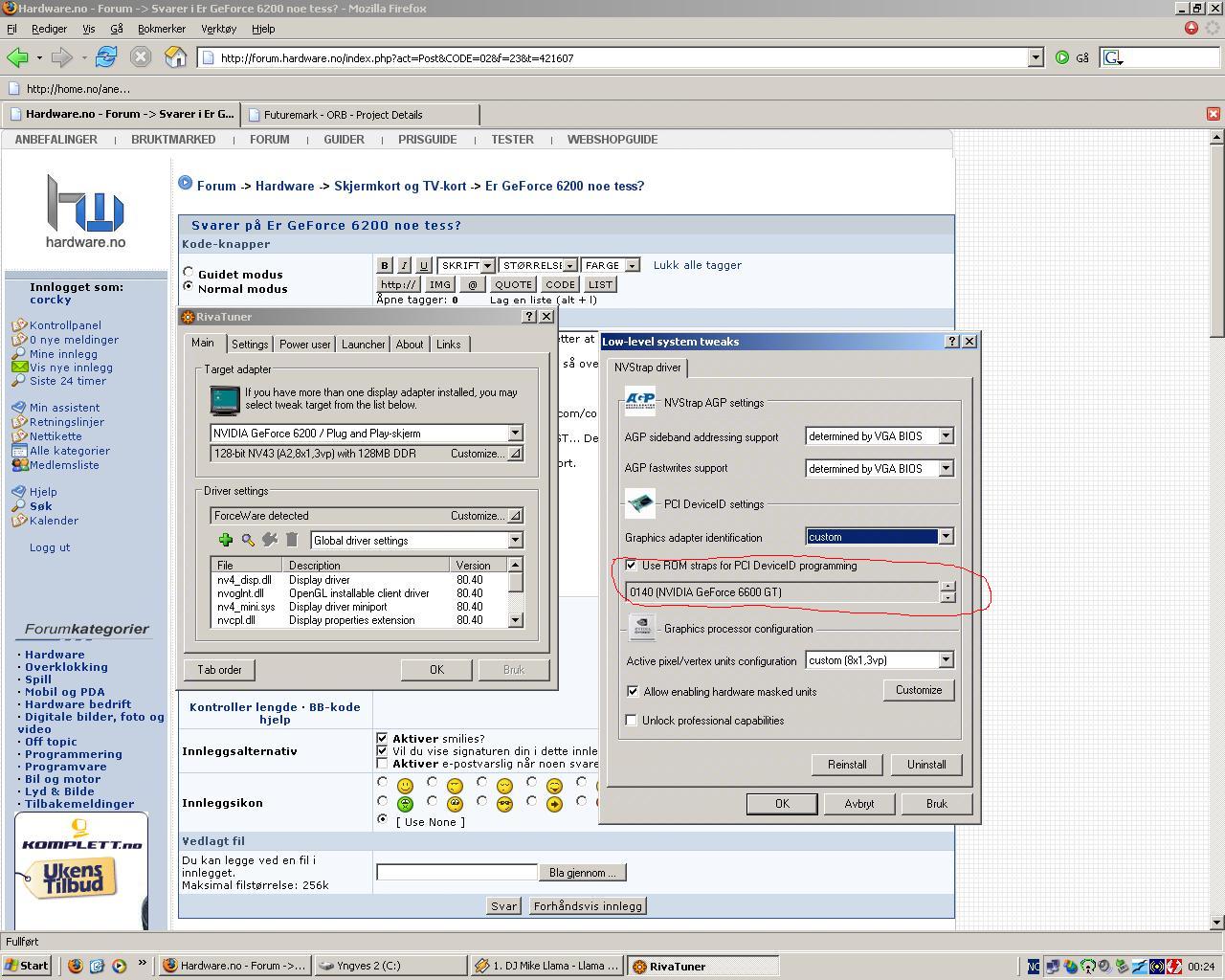 corcky Skrevet 13. september 2005 Skrevet 13. september 2005 Kortet blir gjennkjent som 6600GT... Dette grunnet ID mod som faktisk øker poengscoren med 5-10 prosent.Noe å prøve for alle med 6200 kort. Om jeg forstår deg riktig så kan f.eks. jeg oppnå 5-10% ytelsesøkning ved å huke på Use ROM Straps? Kan en slik mod på noe som helst måte skade kortet? Huke på "Use Rom straps ja og skifte til 6600GT i feltet under... Jeg har ikke hørt om at det kan skade kortet på noen måte... Har kjørt med dette så lenge 6200 kortet har vært i bruk og den eneste forskjellen er at ytelsen øker med 5-10 prosent..