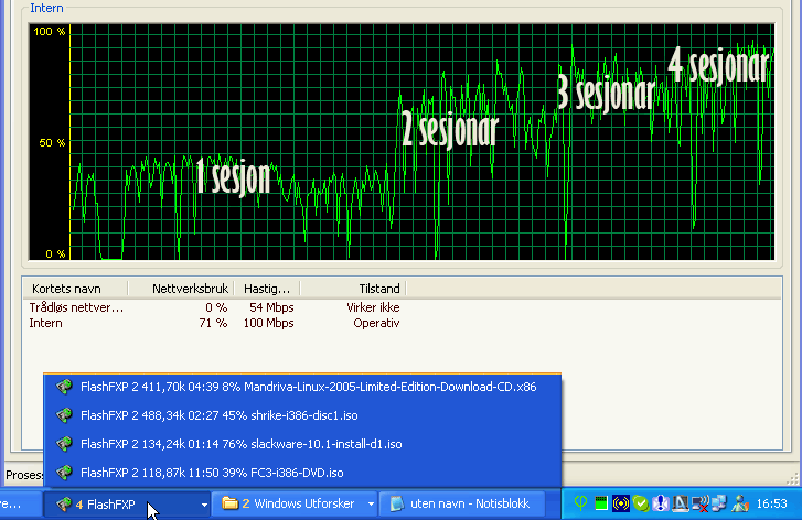 hemo Skrevet 24. mai 2005 Skrevet 24. mai 2005 Eg har testa ein Internettlink på 100 Mbps og får ca 3,5 MBps frå ftp.uio.no. Startar eg f.eks. fira sesjonar får desse mellom 2 Mbps og 3 Mbps kvar. Om eg legg i hop, kjem eg fort opp i 8 MBps, noko som eg er godt nøgd med! Kan eg få tilsvarande fart på den første sesjonen også, når den går åleine?
