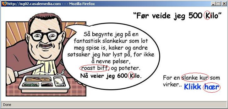 Πεισιθάνατος Skrevet 4. juni 2005 Skrevet 4. juni 2005 Jeg la merke til et rart reklamebanner på en side, så jeg tok likesågodt screenshot av det. Hvem ville gått på noe sånt når det står "advertisement" nederst? Post slike idiotiske reklamebannere hvis dere ser noen, dere også