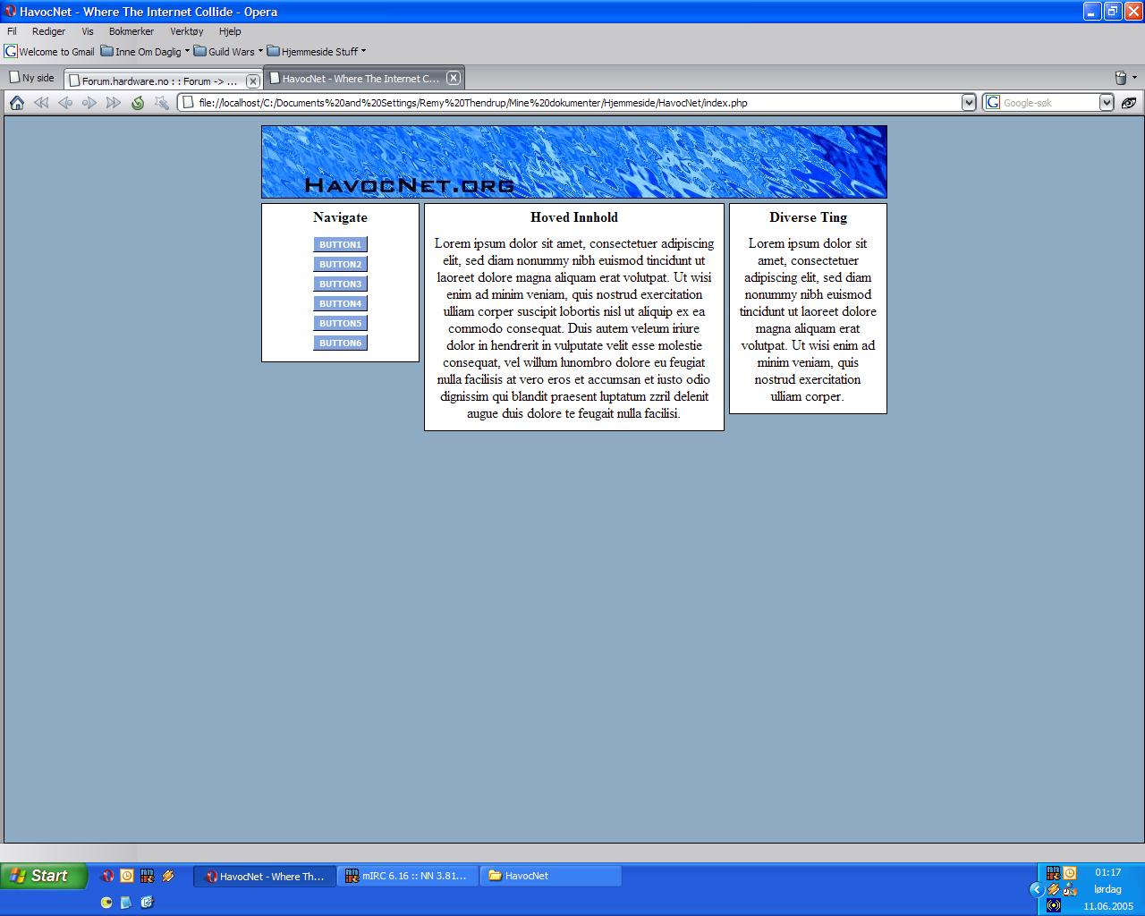 Nitrius Skrevet 11. juni 2005 Forfatter Skrevet 11. juni 2005 (endret) Har lest mange guider, og det jeg leser her også, men jeg skjønner fremdeles ikke helt hvordan man gjør dette her. Ja dere sier "han er nok stok dum" kan være det men har nettopp kommet meg inn i CSS og HTML så er litt vansklig å forstå ting for meg enda, værtfall når det gjelder PHP. Er det ingen som kunne prøvd å forklart meg enda litt dypere hva jeg må gjøre for å inkludere ting og tang der det står "hoved innhold" for når folk navigerer rundt på siden min (se BUTTON1,2,3,4,5,6 osv på bilde) når de da trykker på en av de knappene som f.eks heter "Om Meg" så vil teksten jeg har skrevet om meg poppe oppe i "hoved innhold" slik at folk ikke trenger å laste ned hele siden på nytt, det blir også enklere for meg sånn at jeg slipper å lage et nytt design for vær ting som skal være på siden. Så jeg hadde blitt evig takknemlig om noen kunne prøvd å forklart meg dette så enkelt som mulig og så best som mulig, det hadde jeg satt veldig stor pris på. Edit: hadde også vært fint med litt forklarelse om hva de forskjellige ting i koden gjør, tror kansje det kan være litt lettere for meg å skjønne da. Edi2: <!DOCTYPE html PUBLIC "-//W3C//DTD XHTML 1.0 Transitional//EN" "DTD/xhtml1-transitional.dtd"> <html> <head> <title>HavocNet - Where The Internet Collide</title> <link rel="stylesheet" type="text/css" href="stilark.css" /> </head> <body> <div id="frame"> <div id="contentheader"></div> <div id="contentleft"> <h1>Navigate</h1> <ul> <li><a href="#" class="button">button1</a></li> <li><a href="#" class="button">button2</a></li> <li><a href="#" class="button">button3</a></li> <li><a href="#" class="button">button4</a></li> <li><a href="#" class="button">button5</a></li> <li><a href="#" class="button">button6</a></li> </ul> </div> <div id="contentcenter"> <h1>Hoved Innhold</h1> <p>Lorem ipsum dolor sit amet, consectetuer adipiscing elit, sed diam nonummy nibh euismod tincidunt ut laoreet dolore magna aliquam erat volutpat. Ut wisi enim ad minim veniam, quis nostrud exercitation ulliam corper suscipit lobortis nisl ut aliquip ex ea commodo consequat. Duis autem veleum iriure dolor in hendrerit in vulputate velit esse molestie consequat, vel willum lunombro dolore eu feugiat nulla facilisis at vero eros et accumsan et iusto odio dignissim qui blandit praesent luptatum zzril delenit augue duis dolore te feugait nulla facilisi.</p> </div> <div id="contentright"> <h1>Diverse Ting</h1> <p>Lorem ipsum dolor sit amet, consectetuer adipiscing elit, sed diam nonummy nibh euismod tincidunt ut laoreet dolore magna aliquam erat volutpat. Ut wisi enim ad minim veniam, quis nostrud exercitation ulliam corper.</p> </div> <br clear="all" /><!-- without this little <br /> NS6 and IE5PC do not stretch the frame div down to encopass the content DIVs --> </div> </body> </html> Her har dere koden som er i index.php fila mi vis det hjelper noe. Endret 11. juni 2005 av ToxicMan
