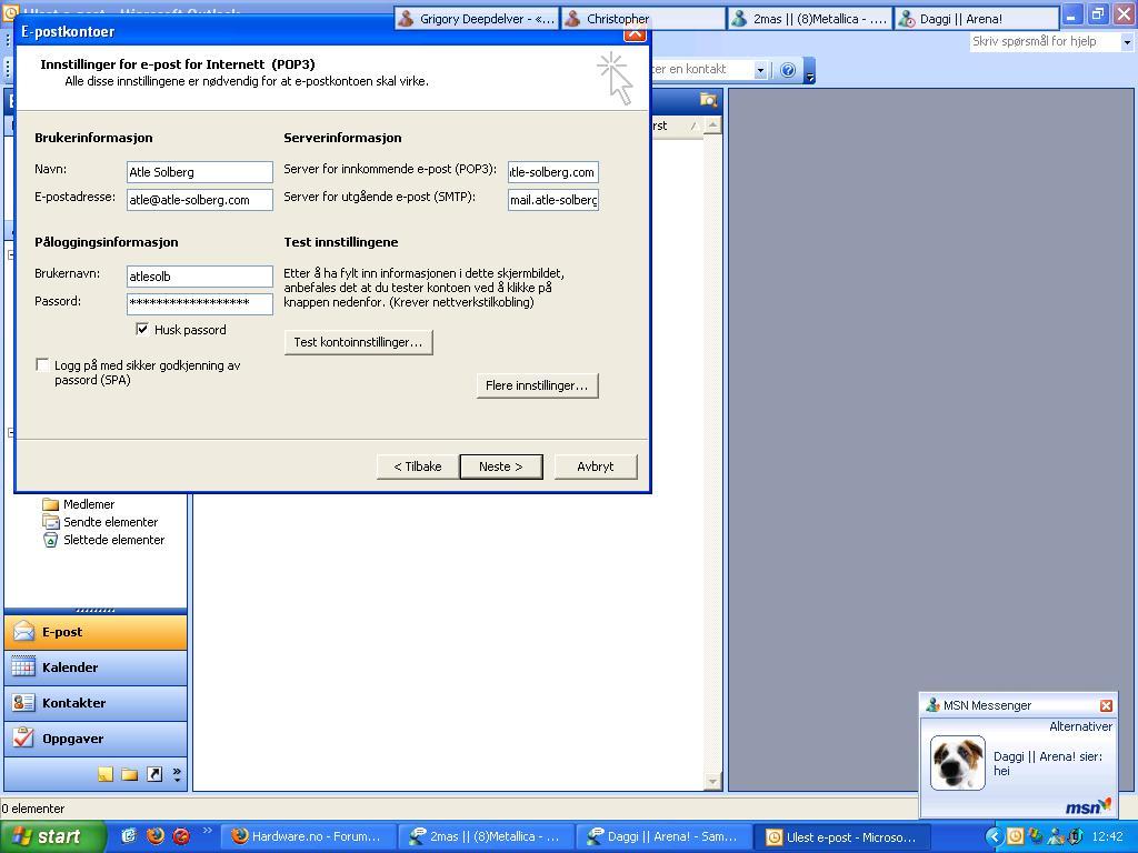 Goscinny Skrevet 16. juni 2005 Skrevet 16. juni 2005 Hei! Jeg har nylig installert Sygate Personal Firewall. Jeg bruker også Microsoft Outlook til mailleser. Inni programmet har jeg to mailer: En Hotmail og ein mail fra mitt eget domene, atle-solberg.com fra www.hostean.no. Hotmailen er selvfølgelig koblet opp via http, og den andre mailen min POP3. På Hostean's FAQ står det hvordan jeg skal koble opp: POP3: mail.atle-solberg.com SMTP: mail.atle-solberg.com Da jeg satte opp accounten [email protected] i Outlook testet jeg den, og alt så ut til å virke greit. Men jeg mottok aldri noen mail fra testprosedyren. Da jeg sjekket webmailen, så jeg at testmailen lå der. Så mitt spørsmål er: Hvorfor funker det å sende, og ikke motta mailen? Kan det ha noe med nyinstallerte Sygate Personal Firewall å gjøre? Hotmailen fungerer helt fint.