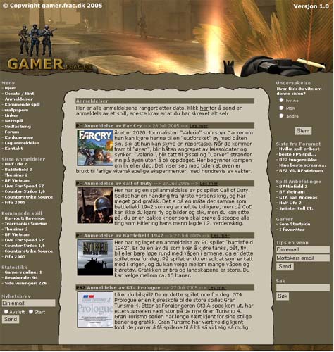 vstr Skrevet 28. juli 2005 Forfatter Skrevet 28. juli 2005 Greit nok ja. Ville kanskje hatt litt mellomrom på toppen av menyene på sidene, de burde kanskje stå på samme høyde som innholdet? ok. men her e link for de som ikke greide seg med et bilde: www.gamer.frac.dk (kun linken "anmeldelser" fungere i menyen, og det er kun der det er innhold og.)
