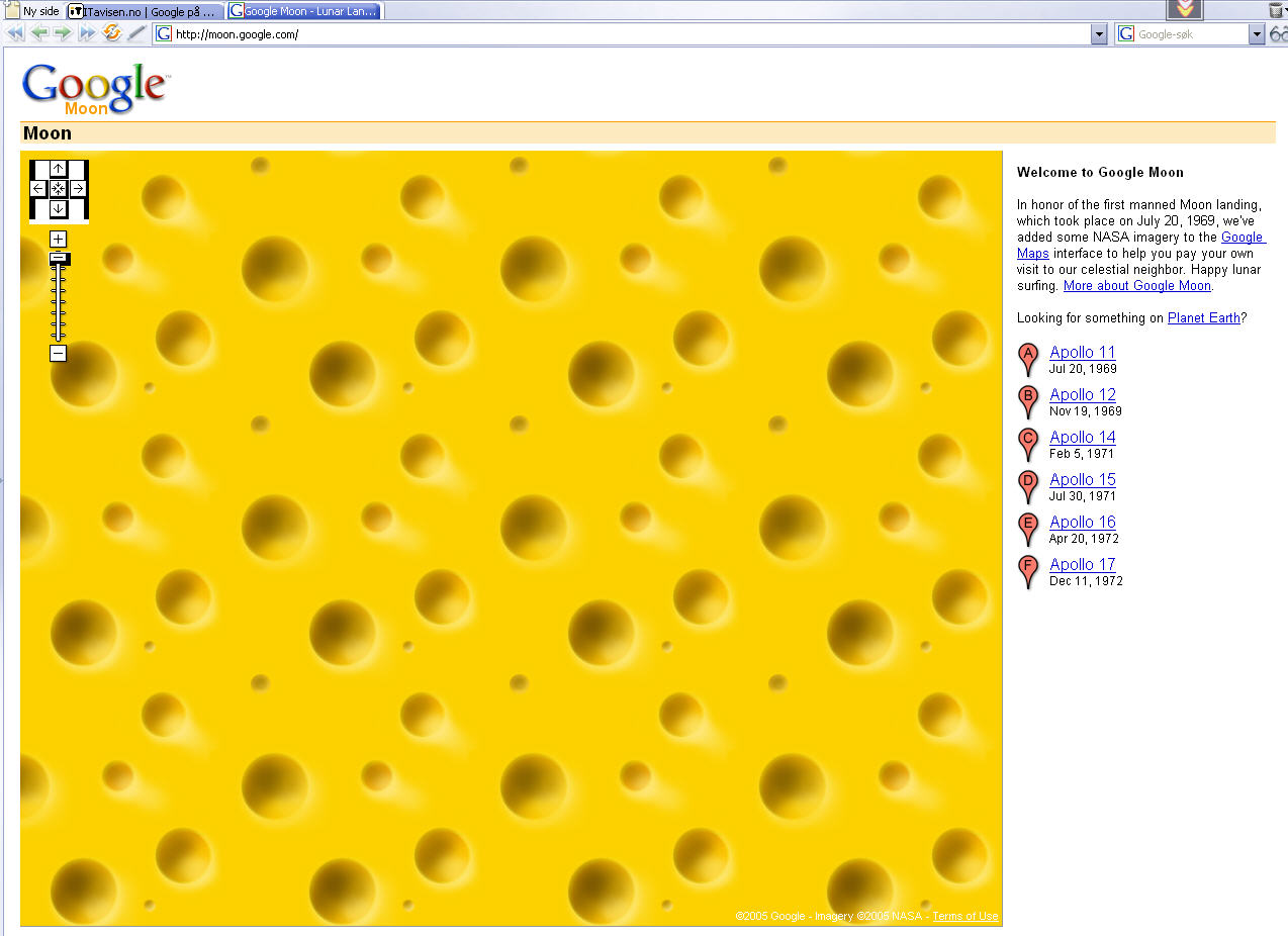 zjulik Skrevet 23. juli 2005 Skrevet 23. juli 2005 Google har gått videre med sitt online kartprosjekt på nettet. Hvis du går inn på:http://moon.google.com/ - så finner du et kart over den delen av månen hvor de berømte Apollo - månelandingene skjedde fra 1969 - 1972. Hvis du peker på de forskjellige landingsplassene, får du opp info om datoer, navnene til astronautene, osv. En artig liten detalj er at, hvis du plukker deg ut en posisjon, og så zoomer inn til max, så forandrer Måneoverflaten seg plutselig til en hullete sveitserost (se bildet) he he he DAGENS!!!