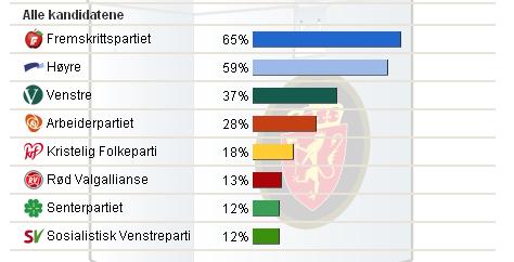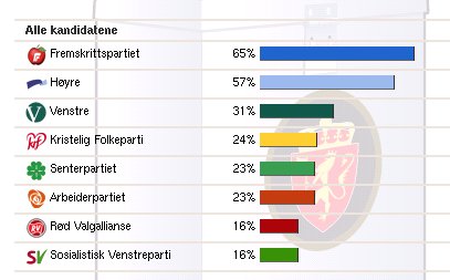 Forøvrig er den på TV2 ganske morsom, der hvor den lister opp hva de forskjellige aldersgruppene vil stemme etter fullendt test; Alle fire aldersgrupper er dominert av FrP :)
