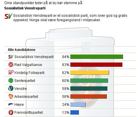 Som forventet. Men en dårlig test. Alt for få spørsmål, samtidig som man ikke kan velge hvor viktig hver sak er. Nettavisen sin er også temmelig dårlig.