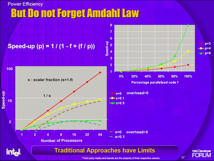 Anders Jensen Skrevet 27. august 2005 Skrevet 27. august 2005 (endret) Vincent og snorreh er jo kjent for å strekke fakta rimelig langt for å kunne disse IPF nok en gang. Dette er etter min mening nok et slikt tilfelle. At lille Vincent går midt imot storheter som Cray og Amdahl (som egentlig er loven Cray her legger til grunn) er i kategorien "søtt å se på". "Lille Vincent", er det et forsøk på å være morsom? Vincent har rimelig god erfaring og peiling på benchmarking, spesielt med SMP-systemer (IA32, AMD64 og IA64). Ja, poenget var å være litt morsom/spydig. Jeg kunne vært litt styggere og sagt "oppblåste Vincent" med referanse til at han som resultat av sin suksess med sjakk-programmering har begynnt å gå midt imot allmenakseptert vitenskap på et fagområde han ser ut til å ha lite peiling på. Du kan vel si suksessen har gått litt i fletta på han. (Det er jo "tilfeldigvis" en post på Ace's som omhandler dette akkurat nå. http://www.aceshardware.com/forums/read_po...39261&forumid=1 *ler seg skakk* Vinnie er som du sikkert forstår en annerkjent uarch ekspert. NOT :!: ) Et godt tips er å ikke lese tallene til Cray for eksakt, neste er å forsøke å skalere en applikasjon med lite parrallellitet på en stor masin eventuelt cluster og merke seg hvor skaleringen begynner å bli negativ. Dvs. legg til en ekstra CPU og få mindre ytelse enn du hadde. Ofte skjer slikt allerede ved 16 noder i et cluster. Dette er ikke noe nytt, og noe som alle vet som har jobbet med SMP- og kluster-systemer en stund. Man snakker ofte om skaleringsfaktorer, der Open MP-basert programvare i beste fall har en skaleringsfaktor på opptil 1.4-1.5, mens MPI-basert programvare klarer opptil 1.8-1.9. Dette avhenger selvsagt av hvor raskt prosessorene kommuniserer med hverandre, og da blir I/O- og minne-båndbredde spesielt viktig. Det finnes mange løsninger som fungerer ganske bra, fra InfiniBand PCI-X, Pathscale InfiniBand HTX og Cray RapidArray til NUMA og Newisys HORUS. Det blir spennende å se hvilken løsning SUN har valgt i sin kommende Galaxy-serie. Disse skaleringsfaktorene er bare forenklede antagelser (de er førsteordens og dermed umulige for større variasjoner av antall noder, en bør bruke andreordens som et minimum) med svært begrenset gyldighetsområde. Du trekker her frem en helt annen del av skalerings konseptet enn det jeg påpekte. Selv en skalering på 1.1 er gulle godt om skaleringen holder seg slik for et vilkårlig antall noder. Poenget er at så aldri er tilfellet. Skaleringsfaktoren avtar for hver node du legger til (grovt sett, ser bort fra memmory effects som kan gjøre seg gjeldende i begynnelsen av kurven) og det var poenget mitt. Det burde ikke være for vanskelig å se det; Skaleringsfaktoren avtar når en øker antall noder Edit: Denne sliden viser Amdahl litt mer detaljert, men la meg forklare likevel... Du ser at ved 10% seriell del av koden så vil skaleringen nærmest avta fullstendig ved 16prosessorer gitt den urealistiske (les umulige) forutsetningen at en har null kommunikasjonsoverhead. Ved introduksjon av en ukjent størrelse overhead (rimelig teit å ikke oppgi den...) så viser de et scenario hvor en får negativ skalering fra 16 prosessorer og utover, igjen ved 10% seriell komponent. Endret 28. august 2005 av Anders Jensen