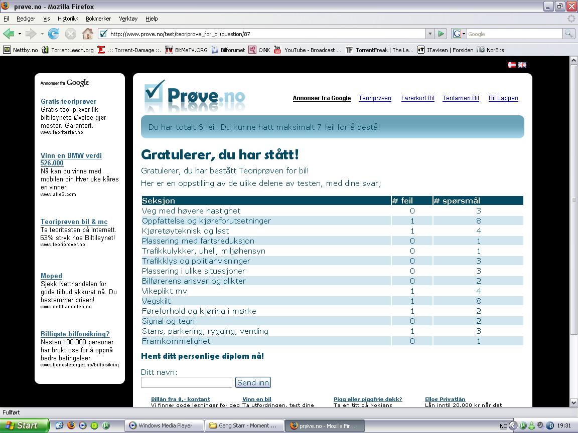 Fredrik Skrevet 1. november 2007 Skrevet 1. november 2007 Ville jobbet litt mer med den teorien, jeg. 6 av 7 mulige feil på en nettbasert prøve kan ikke kalles bankers akkurat. Fortsett å ta prøver, les (og forstå) boka, så minimerer man sjansen for to ukers sperrefrist og sløste penger.