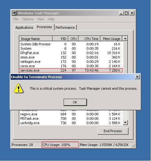 CreativeNX Skrevet 30. september 2005 Skrevet 30. september 2005 (endret) hei jeg har en bærbar PC her som sliter veldig. den har innlagt Windows 2000 SP4 av en eller annen grunn så kjører prosessen Service.exe så mye at den bruker 98-100% av CPU'en!! jeg tror dette kan være ett virus men får ikke fjernet det, og det går heller ikke ann å stoppe prosessen. har prøvd mange forskjellige virusprogram, spyware program og andre program som kanskje kunne hjelpe men ingenting funker. dette her jeg prøvd: Trend Sysclean, Officescan, Norton, Norman, ad-aware, spybot, CCleaner, PC Doctor. ingen av dem har fått service.exe til å slutte med CPU forbruket. kan du/dere hjelpe meg?? bildet jeg legger med viser at det er prosessen SERVICES.EXE som bruker 100% av CPU'en og at det ikke går ann å avslutte prosessen. Mvh CreativeNX NB: jeg må legge til at pc'en er en IBM thinkpad 600 som er veldig gammel og treig fra før av. den har 1 USB1.0 port som ikke fungerer + den tror CD-ROM'en er en diskettstasjon + den har ikke TP-port så må kjøre ISDN på den. for en latterlig maskin.... +++++ at den beregnet for windows 95 eller 98 men noen "smarte" folk har lagt inn windows 2000 SP4 på den.... *sukk* Endret 30. september 2005 av CreativeNX