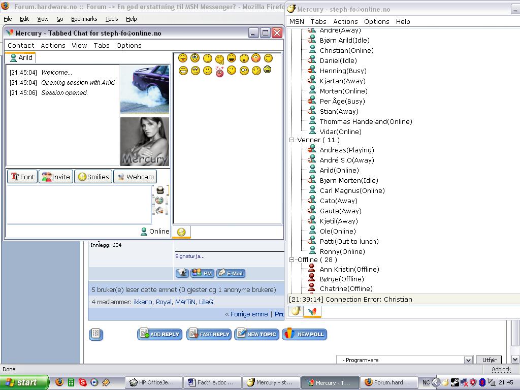 Håvard Skrevet 4. oktober 2005 Forfatter Skrevet 4. oktober 2005 aMSN <3 Glemte å si at jeg har prøvd aMSN. Likte ikke det heller, pga det hender den klikket slik at det åpnet seg et samtalevindu til alle som var pålogget... Dette skjedde flere ganger Det klikker ikke, den bare åpner et vindu når noen i den andre enden gjør det. Kanskje en liten bug, ettersom den da åpner et vindu til alle som viser de som kobler til. @ M4rTiN: Ok.. @ ikkeno: Hvordan fikk du tabbene dine til å stå siden av værandre? Mine kommer over værandre, noe jeg ikke likte.. @ ALLE: Jeg tror jeg ble fornøyd med mercury, men tar gjærne i mot andre tips.. Etter mer testing falt jeg igjen tilbake på MSN Messenger Tror jeg har blitt tatt av msn messenger syndromet.. :/