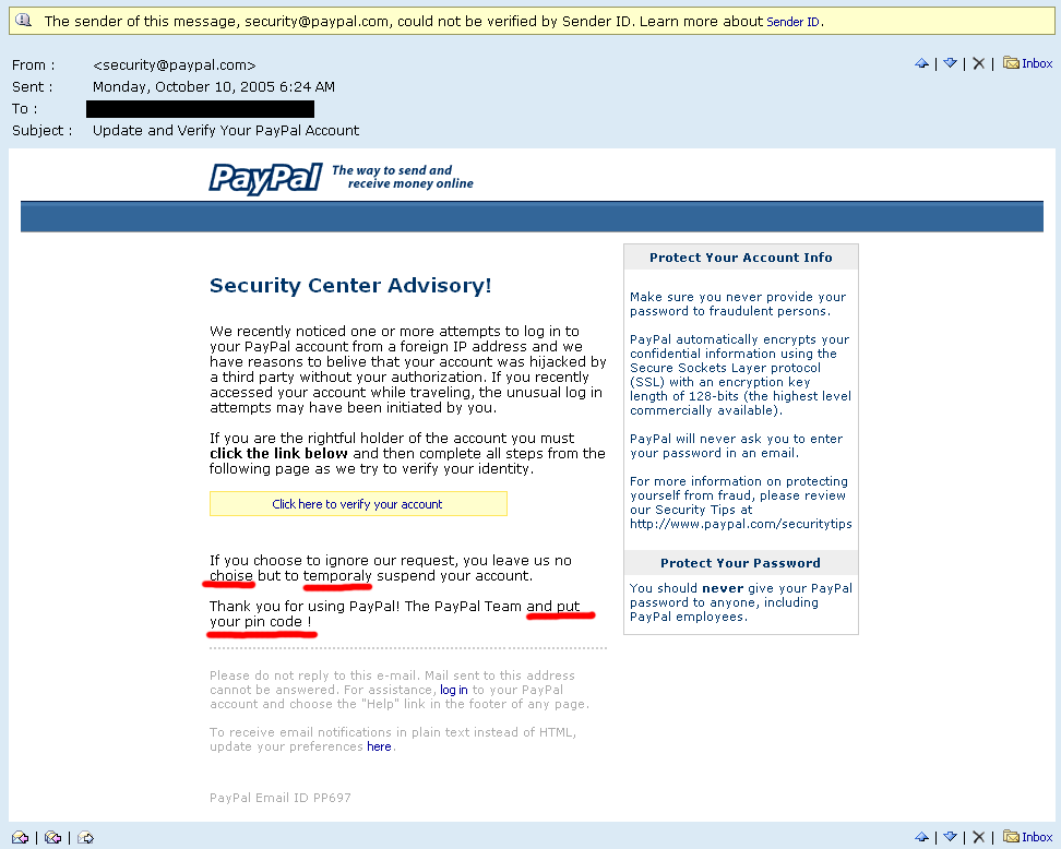Shimano Skrevet 10. oktober 2005 Skrevet 10. oktober 2005 (endret) Sjekk vedlagte screenshot av en mail som dumpet inn i postkassen min Ser jo relativt seriøst ut (bortsett fra et par håpløse skrivefeil) og det faktum at Hotmail selvfølgelig reagerer på avsenderens ID (hvor mange andre e-postprogram gjør det montro...?). Fulgte linken for moro skyld siden den var sendt til en adresse som aldri har hatt noe å gjøre med min PayPal-konto, og jammen kom man ikke til et skjema der man skulle fylle ut (hold dere fast...) Social security number, e-post-adresse, passord til eposten(!!), kredittkortnummer, kode til kredittkortet, førerkortnummer, navn og adresse +++. Tonnevis med personlig informasjon med andre ord. Det skremmende er jo at ganske mange (flere av de jeg jobber sammen med f.eks. - dette er folk som klikker på popup'er fordi 'den sa at maskinen ikke var sikker og jeg vil jo ha en sikker maskin'...) sannsynligvis ville ha fylt ut hele greia hvis de hadde hatt en PayPal-konto som de var redde for. PS: Domenet linken førte til var selvfølgelig ikke et paypal-domene men et som lignet. Og gjett hvem det sto fake-registrert på: 'thugs of america inc' <- LOL! Endret 10. oktober 2005 av Shimano