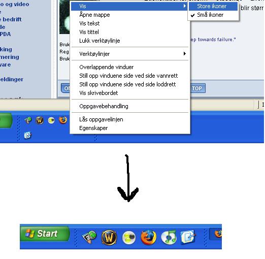 TCi Skrevet 14. oktober 2005 Skrevet 14. oktober 2005 (endret) Nope, funker ikke her, men det er ikke jeg som skal ha store ikoner heller, liker det smått og minimalistisk selv.. 5003030[/snapback] 1. Høyreklikk på oppgavelinje og velg "lås oppgavelinjen" (fjern merket) 2. Det vil ta komme to prikkete kanter på hver side av Quicklaunch. Høyreklikk på den til venstre eller i et tomrom der du ikke treffer noen ikoner. Velg Vis -> Bruk store ikoner (øverst). 3. Lås oppgavelinjen om du ønsker igjen. Endret 14. oktober 2005 av TCi
