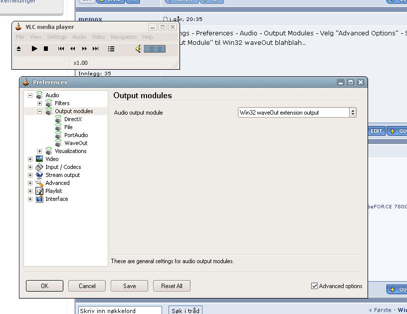memox Skrevet 15. oktober 2005 Skrevet 15. oktober 2005 Settings - Preferences - Audio - Output Modules - Velg "Advanced Options" - Sett "Audio Output Module" til Win32 waveOut blahblah..